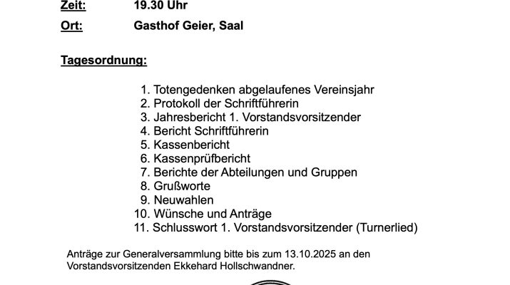 Alle aktiven und passiven Mitglieder des TSV v. 1873 Wörth/Donau e.V. sind herzlich eingeladen zur Generalversammlung 2025 Termin: Freitag, 24. Oktober 2025 Zeit: 19.30